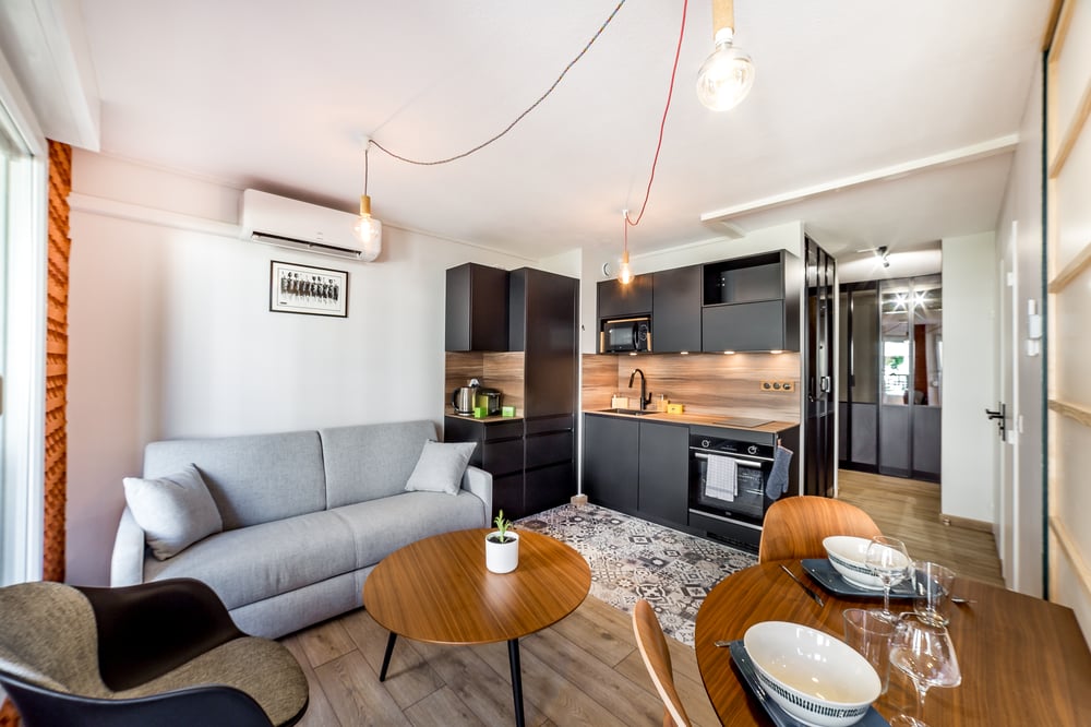 L'appartement se compose d'une entrée avec rangements, d'une cuisine ouverte entièrement équipée, d'une agréable pièce à vivre avec un canapé-convertible pouvant accueillir 2 personnes, un espace nuit avec lit double et bureau et d'une salle d'eau avec douche, lave-linge, sèche-serviettes et miroir LED, WC séparés. Accès au balcon depuis la pièce principale qui donne sur cour. Le studio est équipé d'une bonne connexion wifi et d'une climatisation centrale. Une place de parking au sous-sol de l'immeuble est disponible. Pour votre confort, l'appartement est prêt à vous accueillir. Nous fournissons la blanchisserie de qualité hôtelière (linge de lit déjà mis en place, serviettes, tapis de bain, torchon) ainsi que 3 kits de bienvenue pour la première nuit / le premier matin : 1 kit salle de bain pour 2 personnes (1 shampoing, 1 gel douche, 1 savonnette, 3 disques démaquillant, 4 cotons-tiges, 1 lime à ongle) ; 1 kit comestible pour 2 personnes (2 capsules de café, 2 sachets de thé, 2 sticks de cacao, 3 sucrettes, 2 mini-cookies) ; 1 kit entretien pour le séjour (1 éponge, 1 tablette lave-linge, 1 tablette lave-vaisselle). Inclus dans les frais de ménage.
